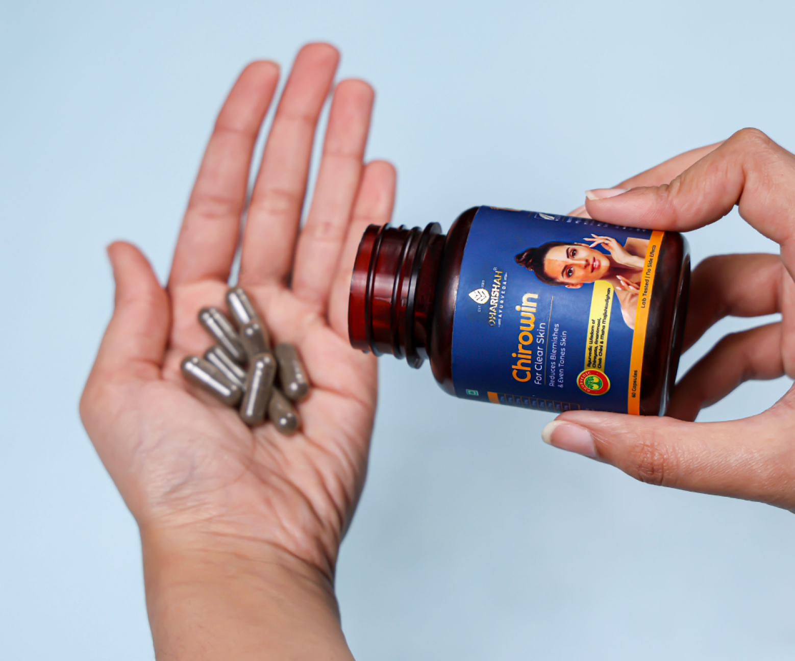As I purchased for my sister, she has dark spots under her eyes. After using this Dharishah Ayurveda's Chirowin capsules for a week, spots are not visible at all and provide a glowing and pretty texture to the skin. It is really a good quality product.