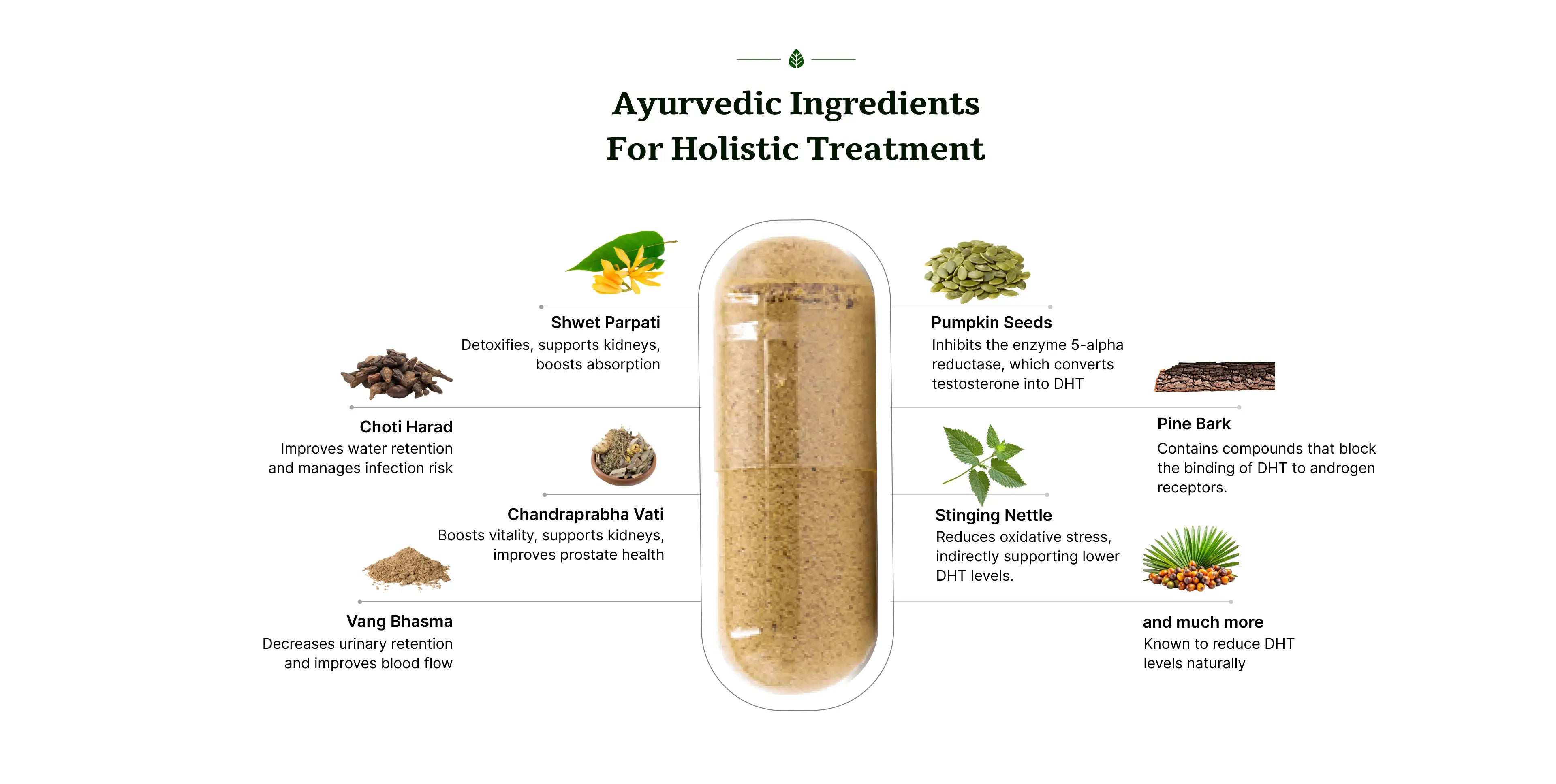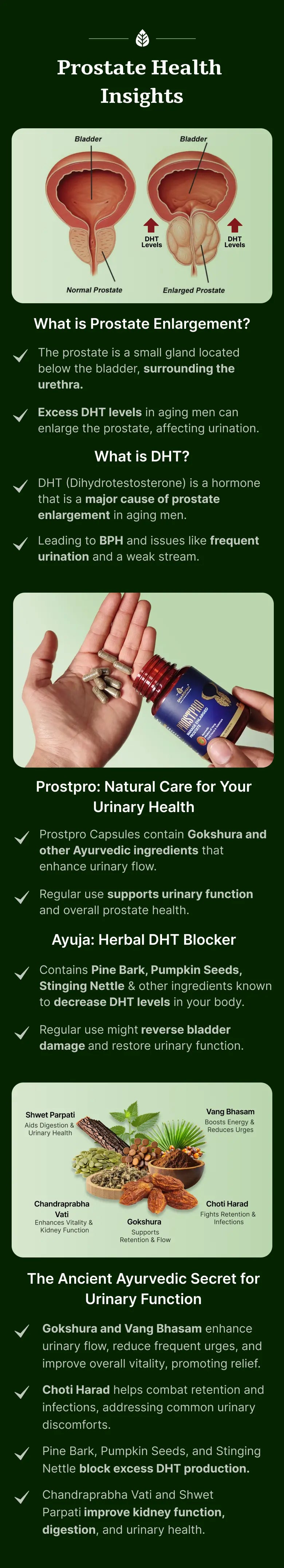 ProstPro Package is a powerful combination of our best-selling ProstPro Capsules and Ayuja, a herbal DHT blocker. Together, they offer an industry-leading Ayurvedic solution for managing urination issues caused by BPH and prostate enlargement.